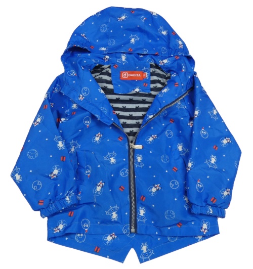 Modrá šusťáková jarní bunda s vesmírem a kapucí