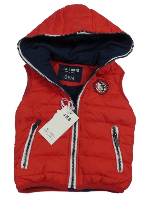 Nové - Červená šusťáková zateplená vesta s výšivkou a kapucí