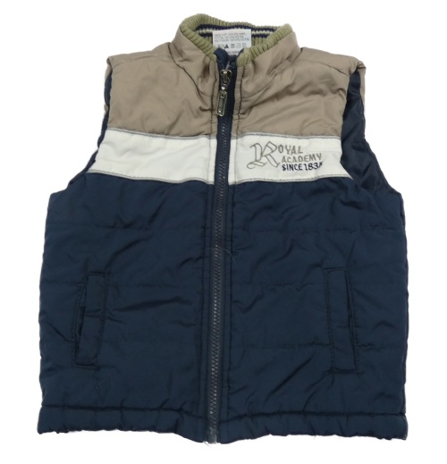 Tmavomodro-béžovo-bílá šusťáková zateplená vesta s nápisem Topolino