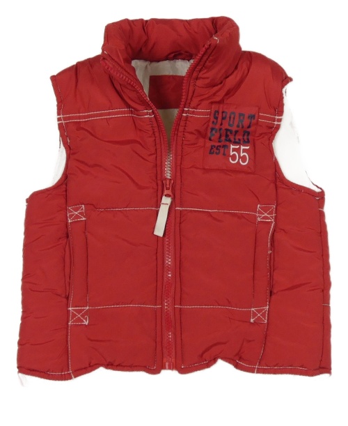 Červená prošívaná šusťáková zateplená vesta s nápisy a číslem
