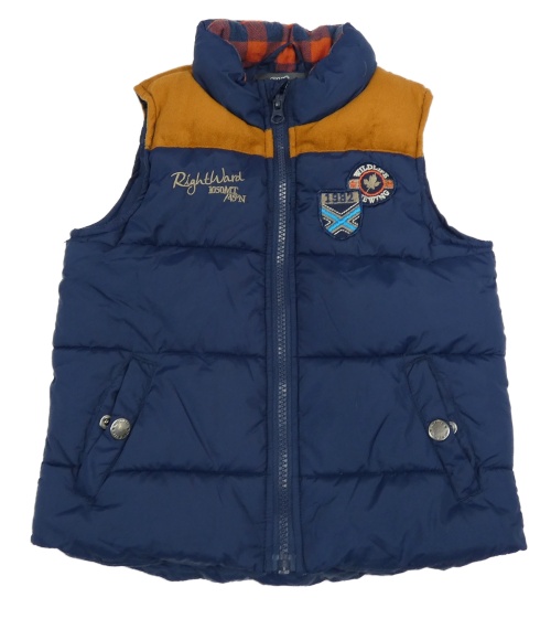 Tmavomodro-medová šusťáková zateplená vesta s nápisem