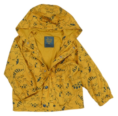 Hořčicová šusťáková jarní bunda s dinosaury a kapucí Tu