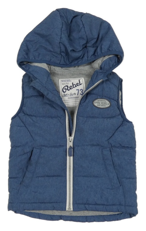 Modrá šusťáková zateplená vesta s nášivkou a kapucí Rebel