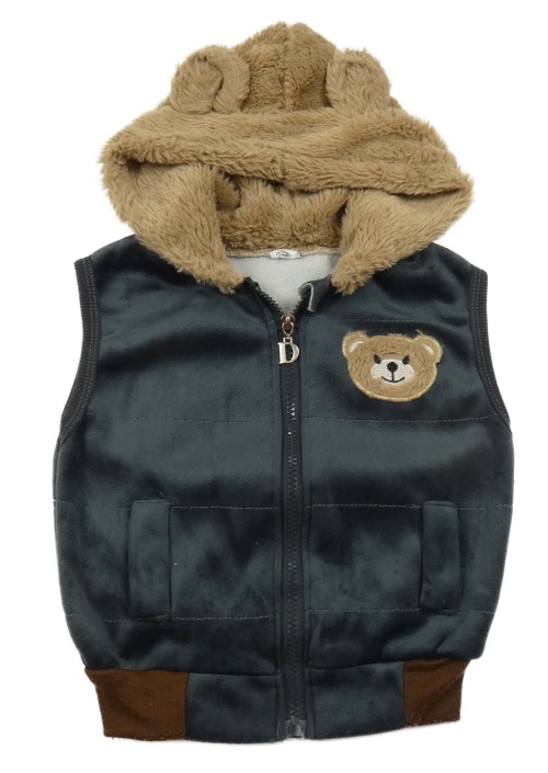 Antracitová sametová propínací vesta s medvídkem a chlupatou kapucí