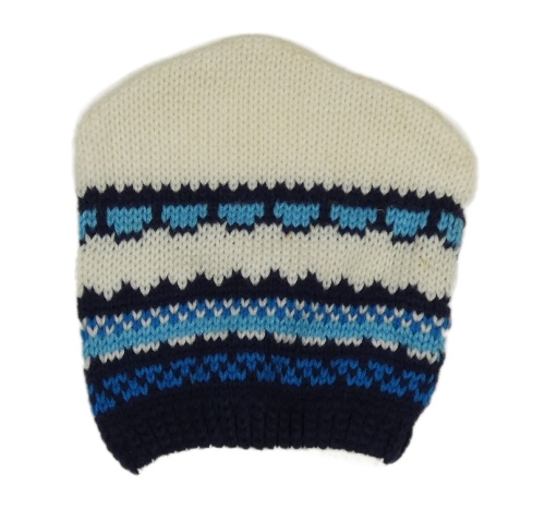 Bílo-tmavmoodro-modrá vzorovaná pletená čepice