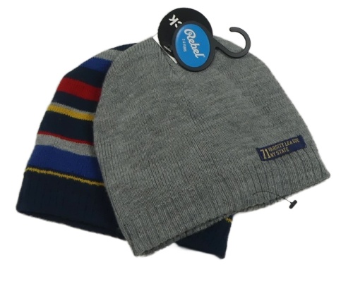 Nové - 2x čepice - šedá + tmavomodro-červeno-šedá pruhovaná čepice Rebel