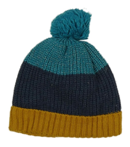 Tmavomodro-zeleno-okrová pruhovaná pletená podšitá čepice s bambulí