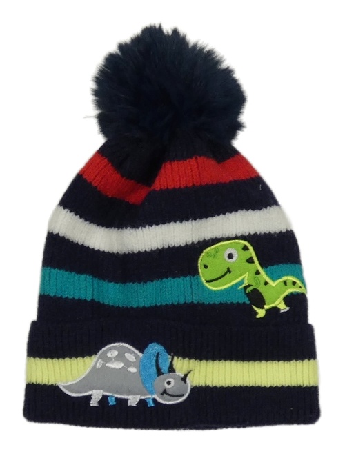 Tmavomodrá pletená podšitá čepice s dinosaury a pruhy