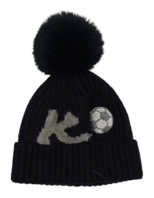 Tmavomodrá žebrovaná pletená čepice s fotbalovým míčem a bambulí