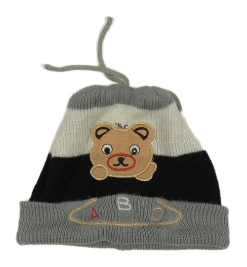 Šedo-bílo-černá pletená čepice s medvídkem a písmenky
