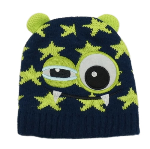 Petrolejovo-limetková pletená čepice s příšerkou a hvězdičkami a oušky