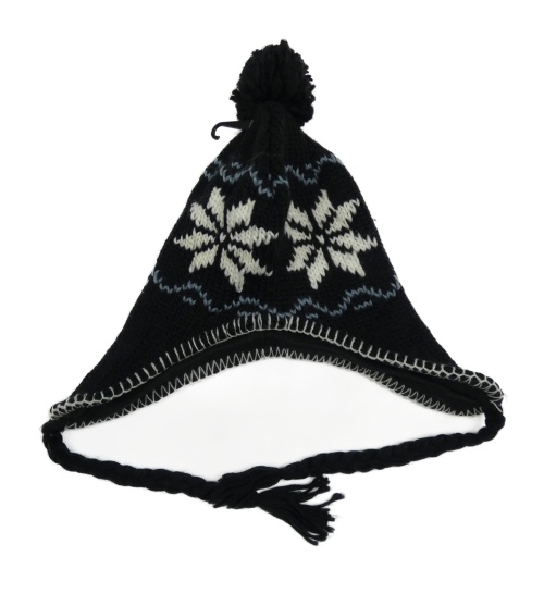 Černo-bílá pletená čepice s vločkami a bambulí