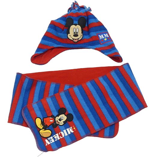 2Set - Modro-safírovo-červená pruhovaná fleecová čepice s Mickey + šála