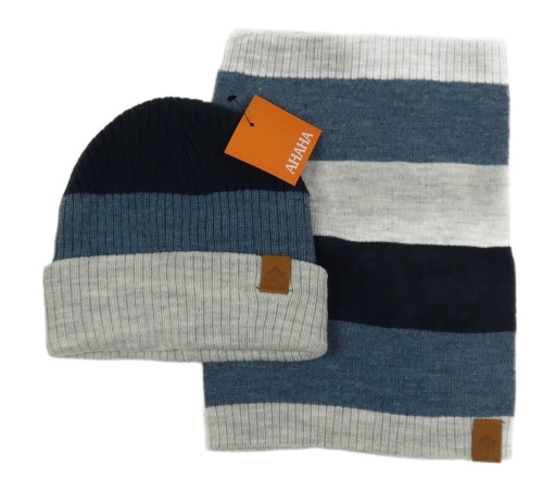 Nové - 2set - Tmavomodro-modrošedo-šedá žebrovaná čepice + nákrčník