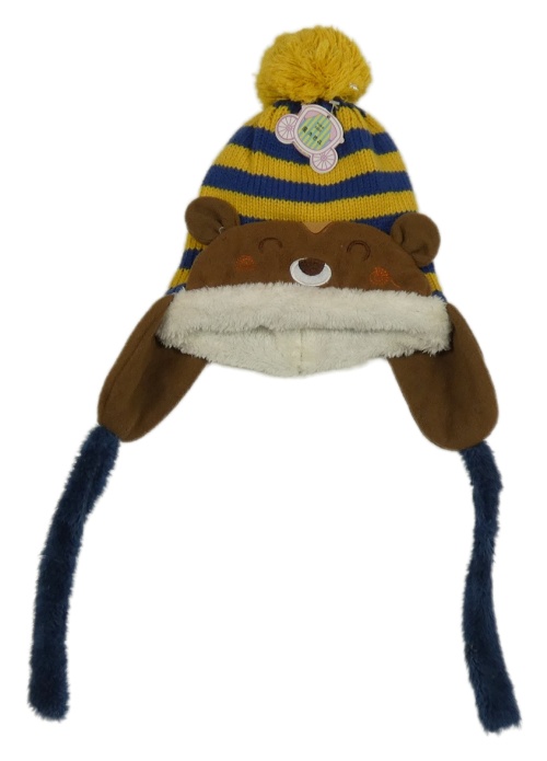 Nové - Žluto-tmavomodrá pruhovaná pletená zateplená čepice s medvědem a bambulí