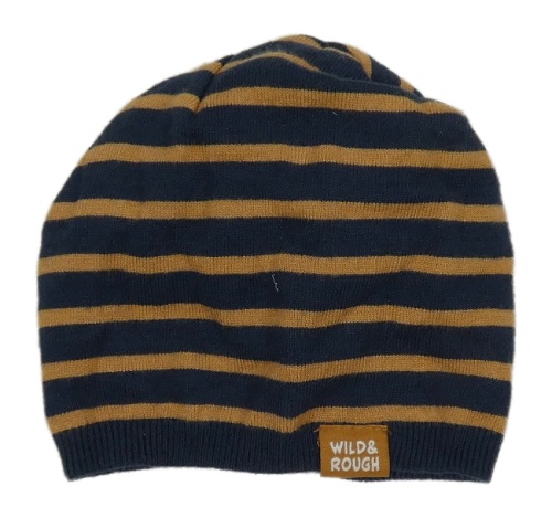 Tmavomodro-světlehnědá pruhovaná úpletová čepice s nášivkou dopodopo