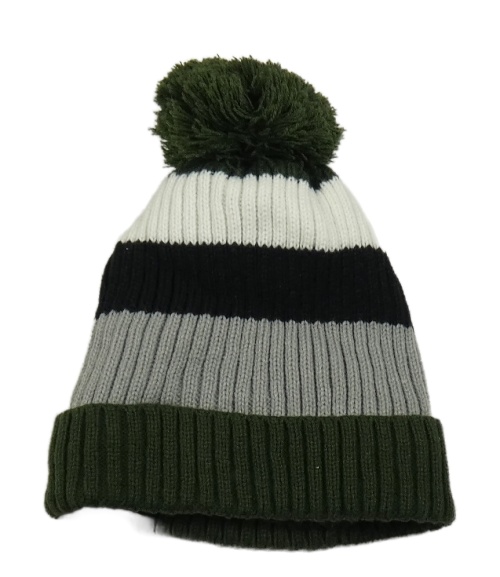 Khaki-šedo-černá pruhovaná pletená zateplená čepice s bambulí