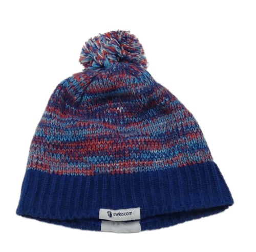 Modro-červená melírovaná pletená podšitá čepice s bambulí