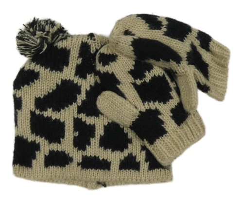 2set - Béžovo-černá vzorovaná pletená čepice s bambulemi + palcové rukavice M&S