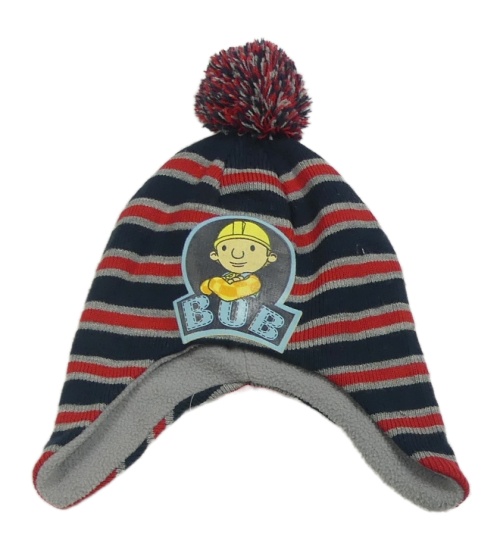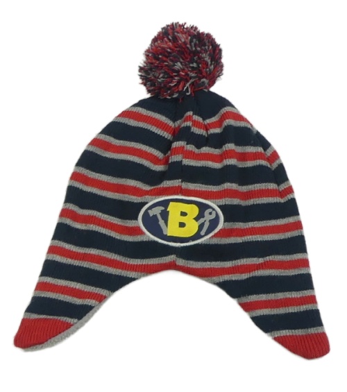 Tmavomodro-červeno-šedá pruhovaná čepice s Bořkem a bambulí