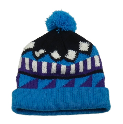 Modro-černo-fialová vzorovaná čepice s bambulí