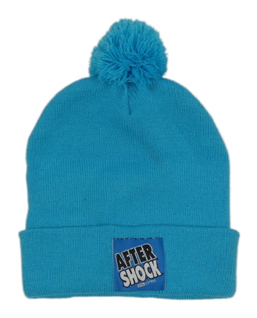 Azurová čepice s nášivkou a bambulí