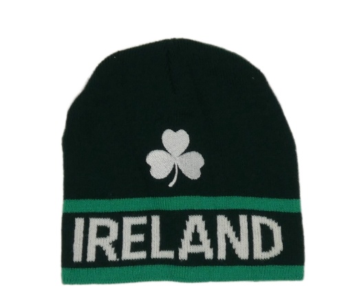 Smaragdovo-tmavozelená pletená čepice s trojlístkem a nápisem a rohy