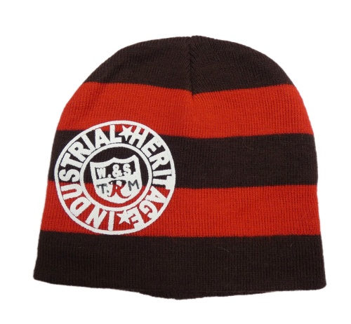 Červeno-hnědá pruhovaná pletená čepice s potiskem