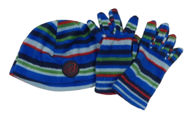 2set - Modro-červeno-zelené pruhované fleecové prstové rukavice + čepice