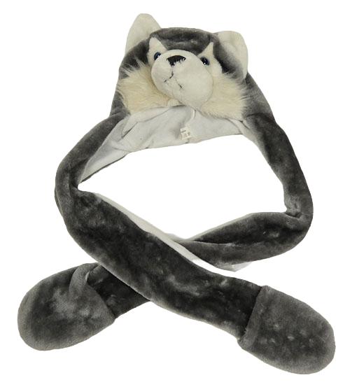 Šedo-bílá chlupatá čepice se šálou - husky