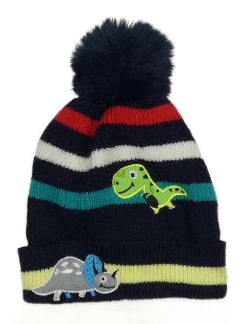 Tmavomodro-barevná pruhovaná čepice s dinosaury a bambulí