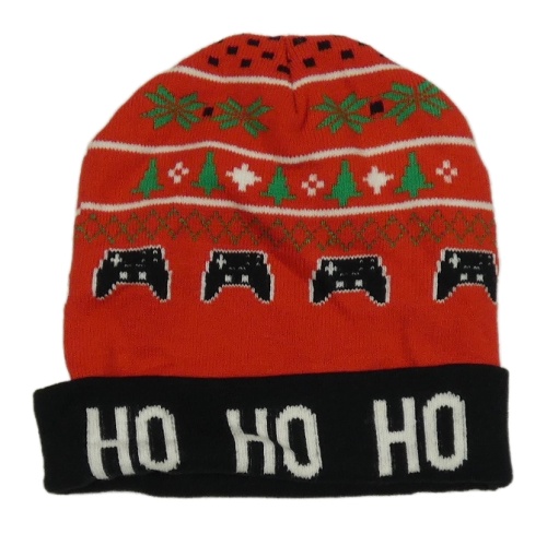 Červeno-černá vánoční čepice s nápisem a ovladači a stromečky a vločkami