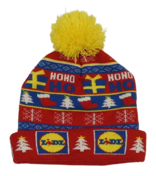 Červeno-modrá vánoční čepice s obrázky a logy