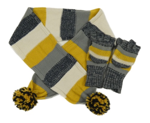 2set - Tmavomodro-šedo-okrová pruhovaná šála s bambulemi + zaklápěcí rukavice John Lewis