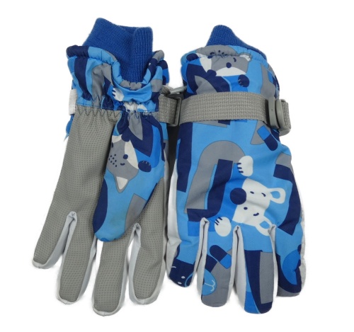 Modro-tmavomodro-šedo-bílé šusťákové zimní prstové rukavice se zvířátky