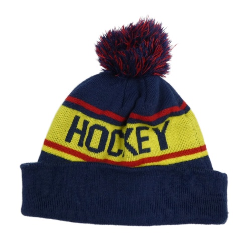 Tmavomodro-žlutá pletená čepice s nápisem a bambulí