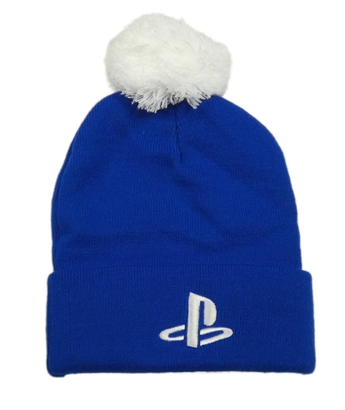 Safírová pletená čepice s logem - PlayStation a bílou bambulí