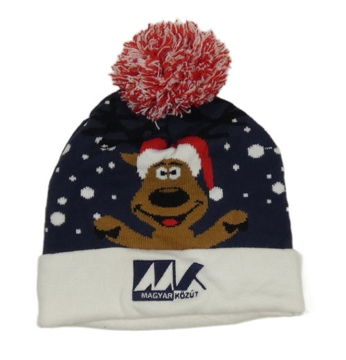 Tmavomodro-bílá pletená čepice se sobem a bambulí