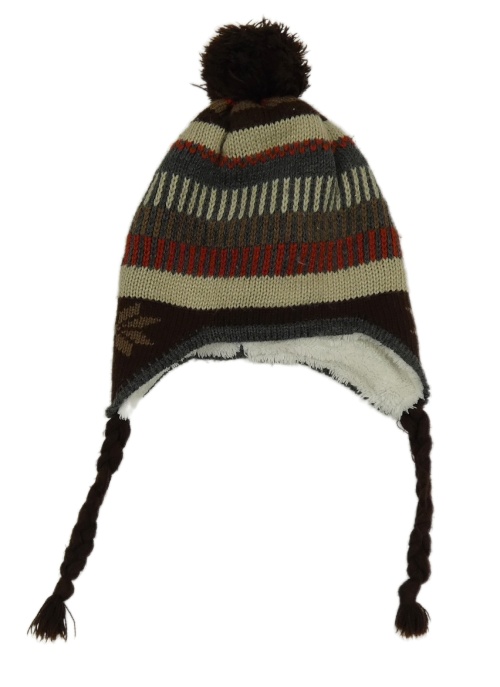 Béžovo-šedo-hnědá vzorovaná čepice s bambulí