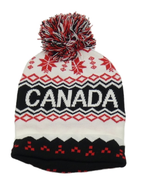 Bílo-černo-červená vzorovaná čepice s nápisem a bambulí