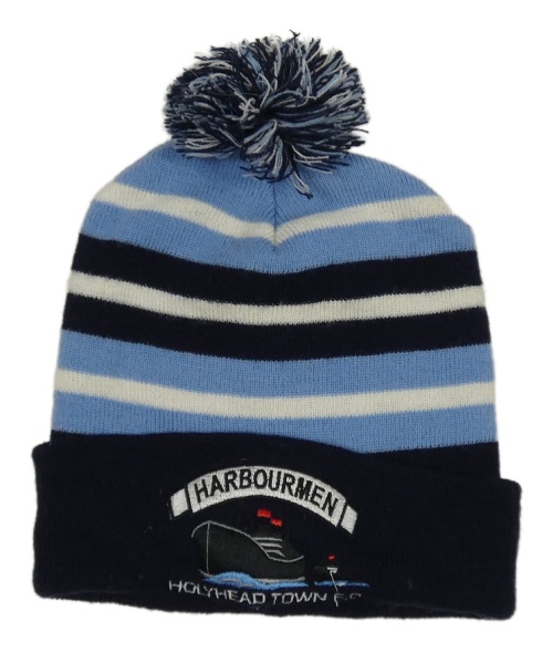 Modro-tmavomodrá pruhovaná čepice s bambulí a nášivkou