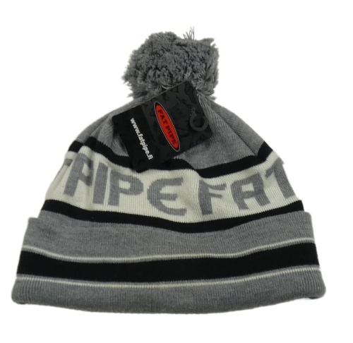 Nové - Šedo-bílo-černá pruhovaná pletená čepice s nápisem a bambulí