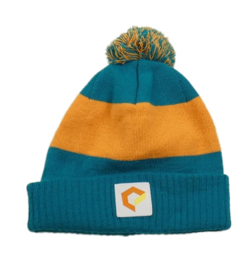 Modrozeleno-oranžová pletená čepice s nášivkou a bambulí