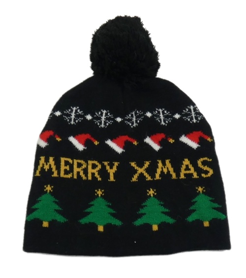 Černá čepice s obrázky a bambulí