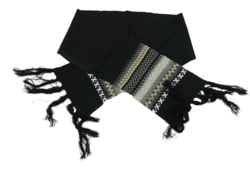 Černá pletená šála s šedobéžovým vzorem a třásněmi