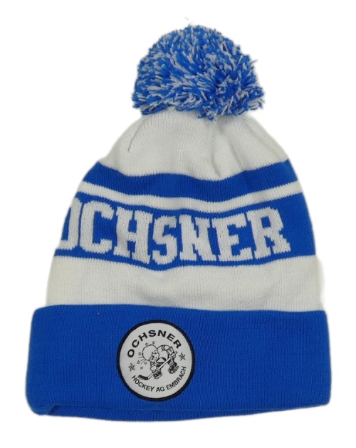 Bílo-modrá pletená hokejová čepice s nápisem a nášivkou a bambulí