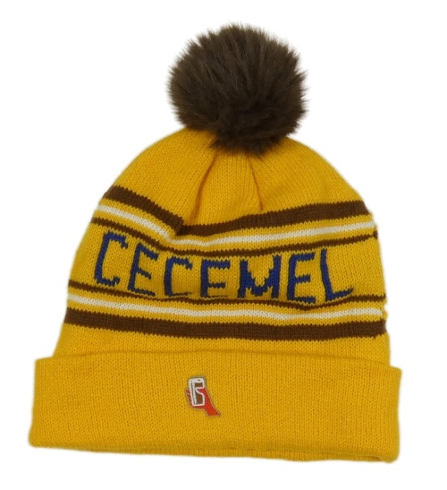 Oková pruhovaná čepice s nápisem a bambulí
