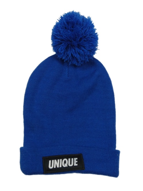 Safírová čepice s nápisem a bambulí