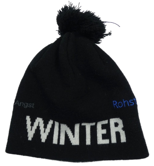 Černá čepice s nápisem a bambulí