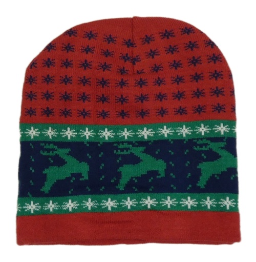 Červeno-zeleno-modrá vzorovaná pletená čepice se soby